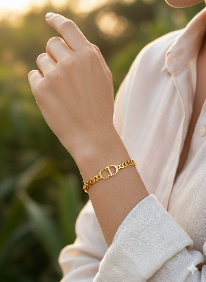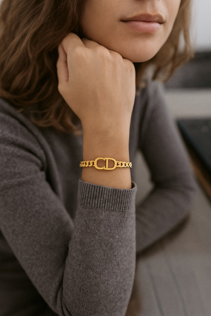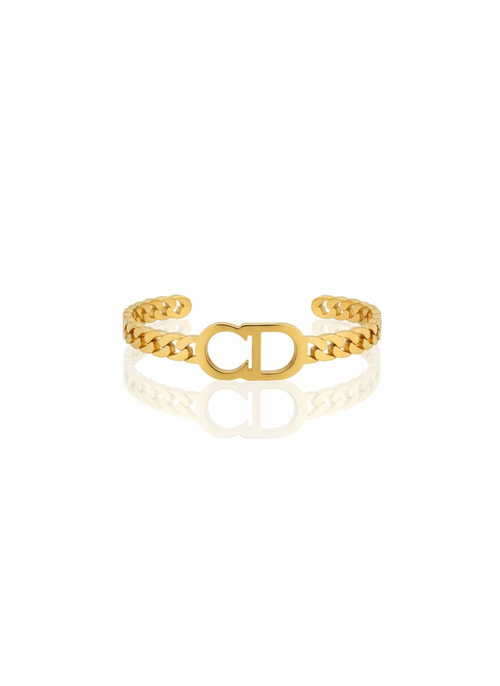 Chic open cuff bracelet made of gold-plated stainless steel, featuring a sleek design with bold CD initials at the center. A refined and stylish addition to your everyday look.