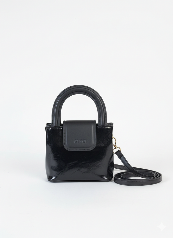 Elevate your look with a perfect blend of luxury and contemporary elegance. Crafted from high-quality patent leather, this compact black bag features a sleek top handle, a detachable crossbody strap, and a magnetic flap closure. The subtle embossed Gucci logo