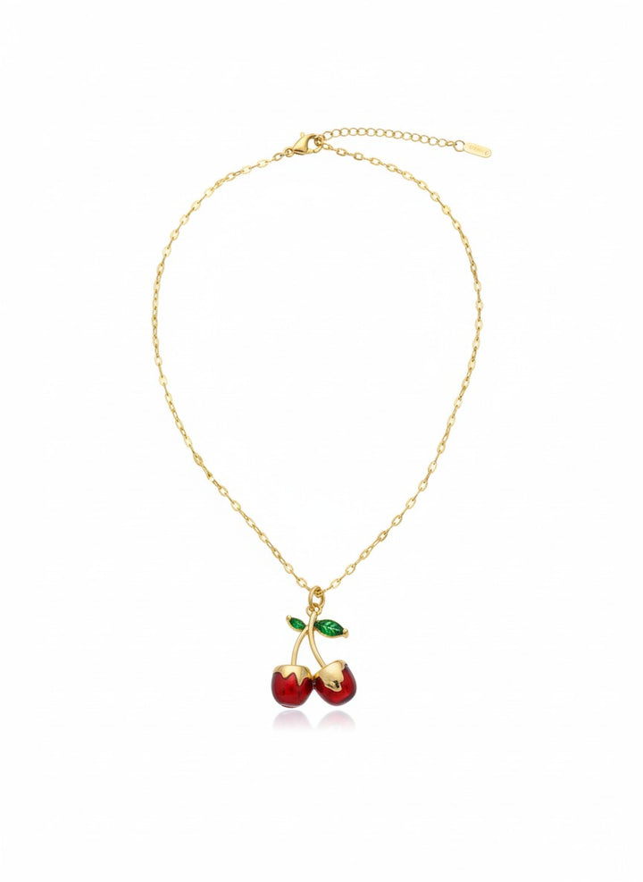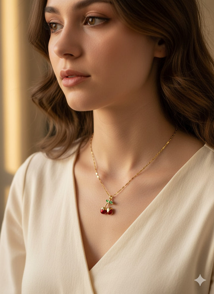 A playful and elegant necklace featuring vibrant red cherry pendants with green leaf details