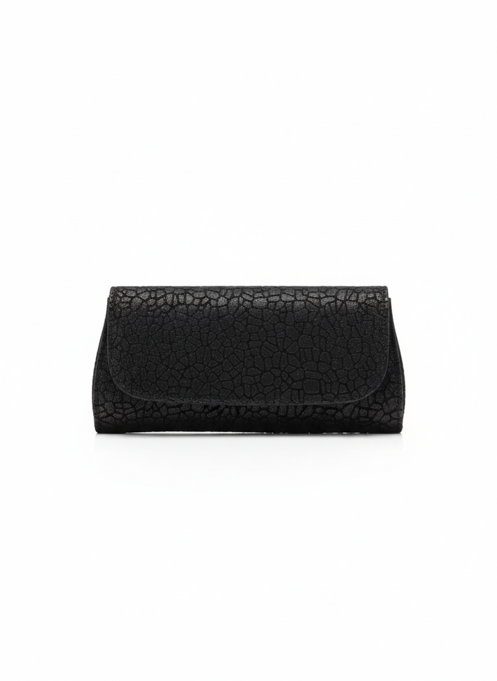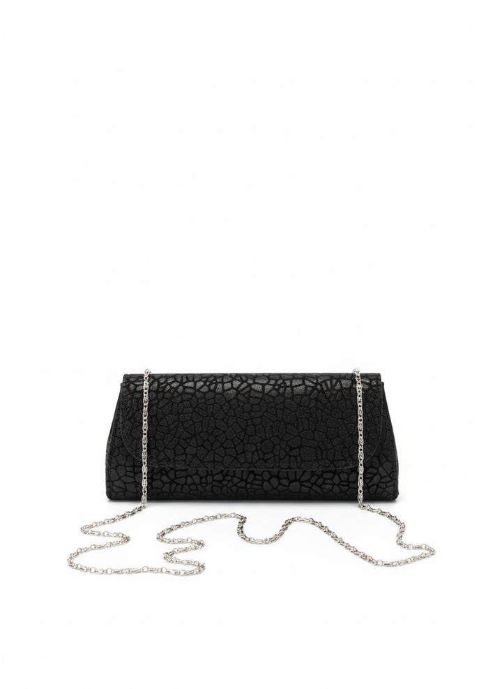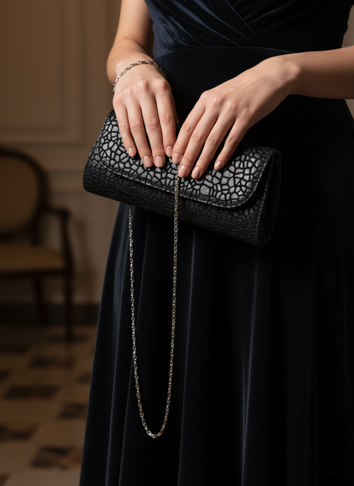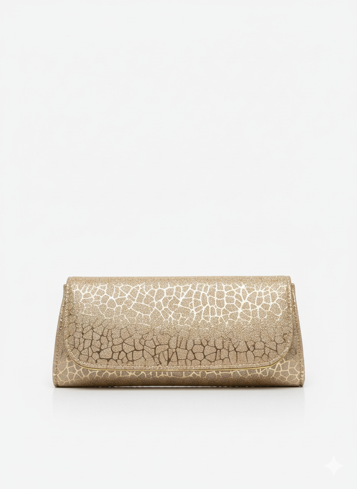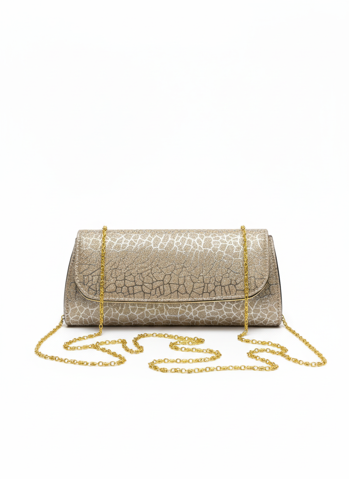 An elegant evening bag made with a shiny textured finish and a subtle crackle pattern. It comes with a gold chain strap that can be worn on the shoulder or tucked inside to use it as a clutch. The size is practical for carrying essentials like your phone, keys, and small makeup items—perfect for events and night outings.