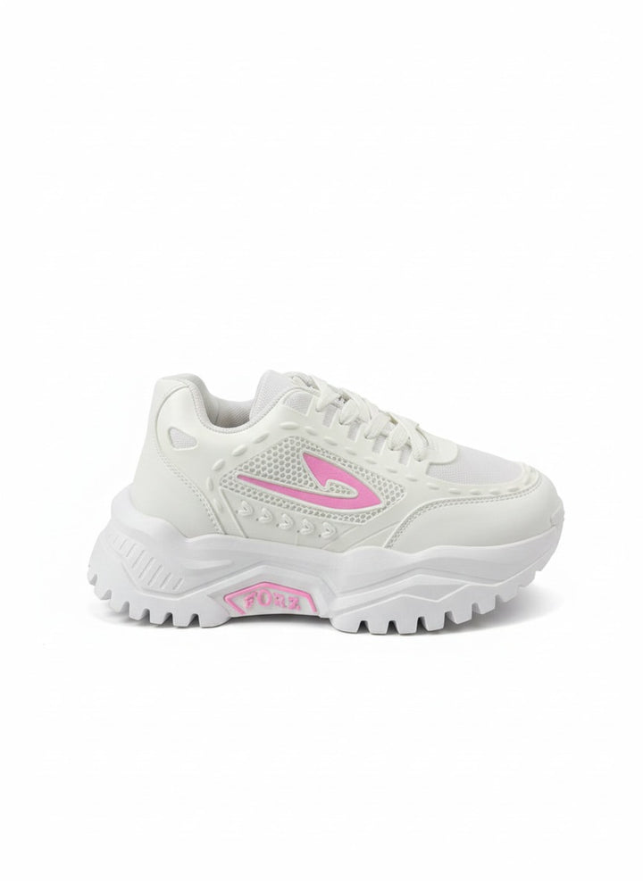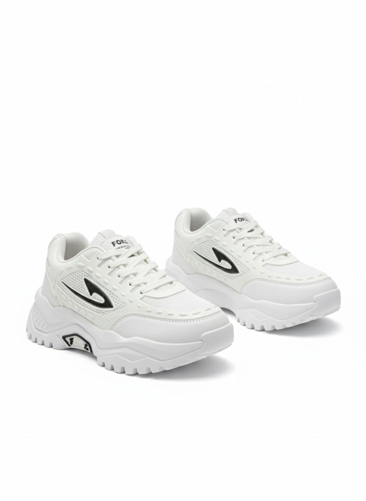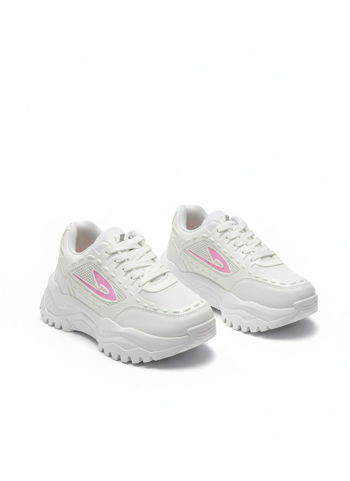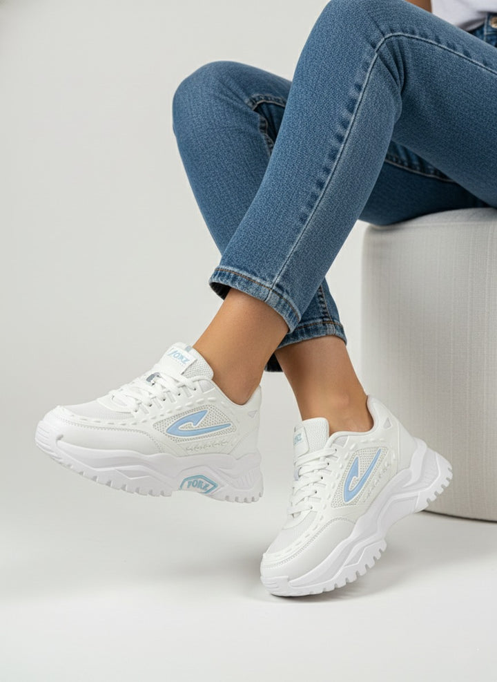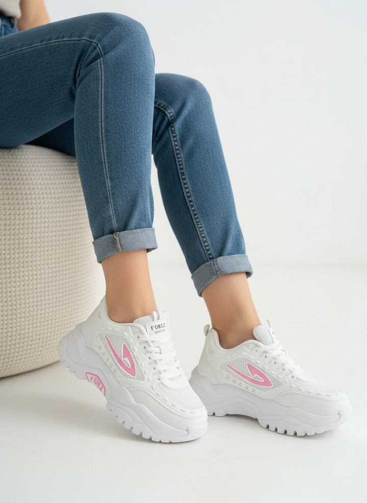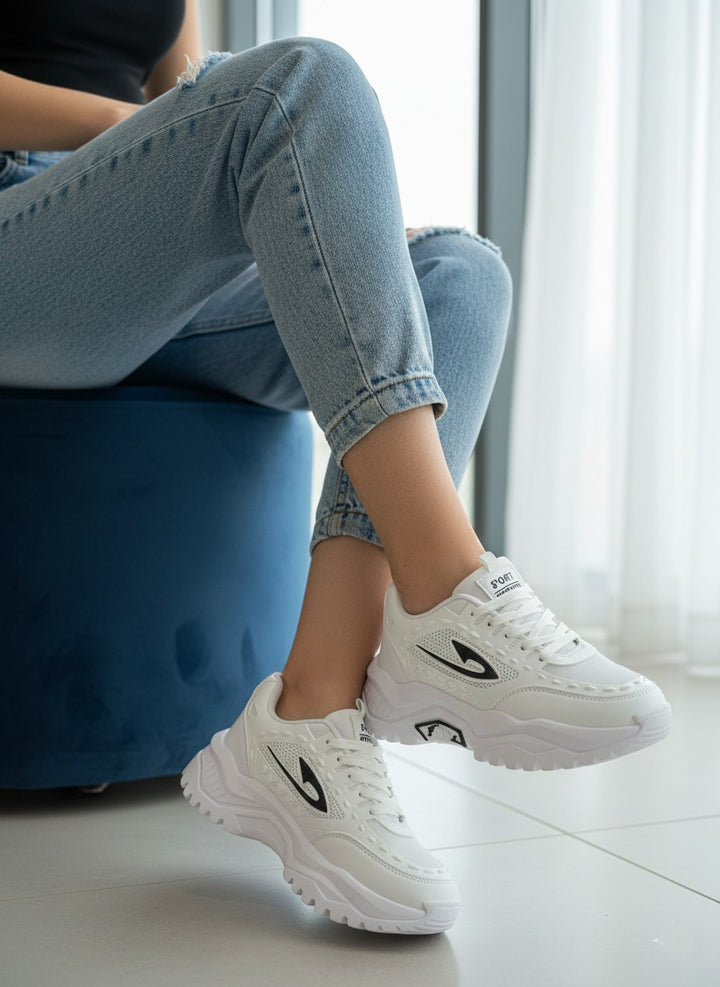 حذاء رياضي عصري سميك، مصمم ليمنحكِ مظهرًا جريئًا وراحة طوال اليوم. مصنوع من مواد متينة وتفاصيل جانبية أنيقة، يتميز بنعل داعم مرتفع يوفر ثباتًا ممتازًا ومظهرًا عصريًا مميزًا.