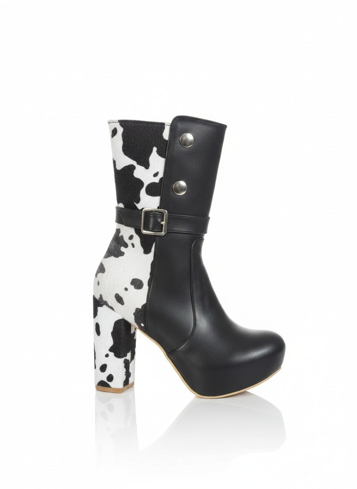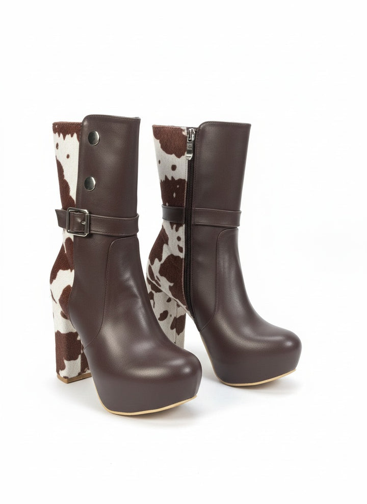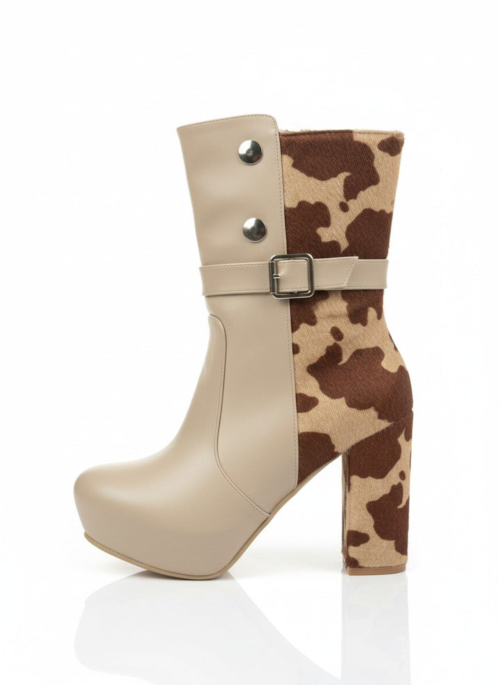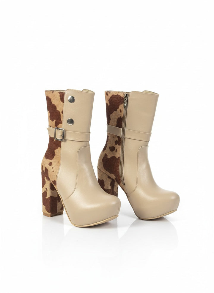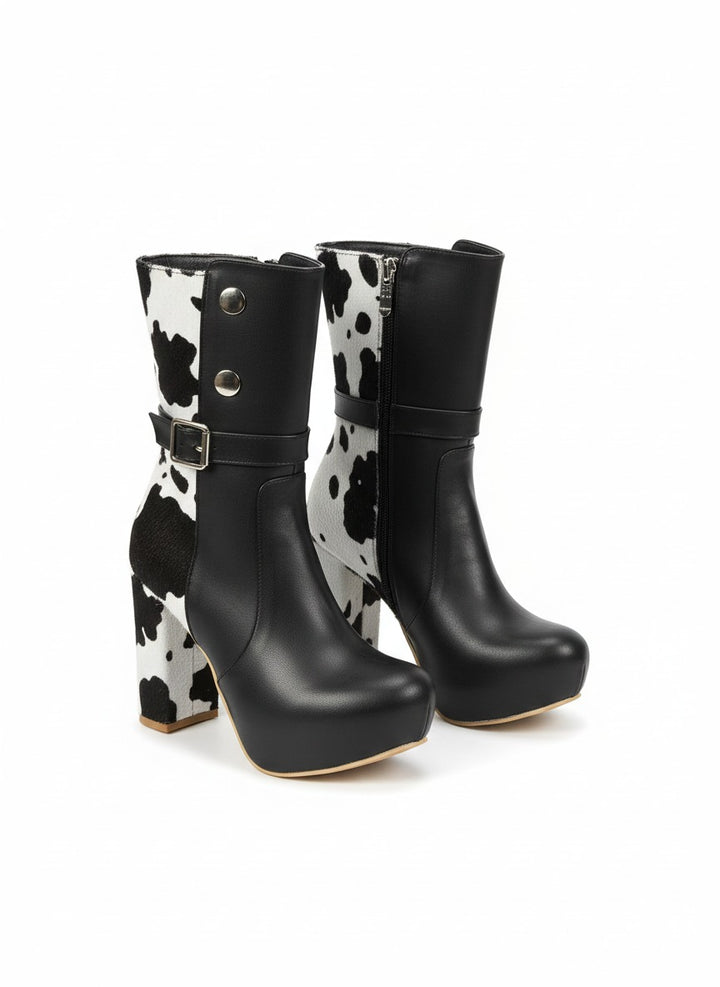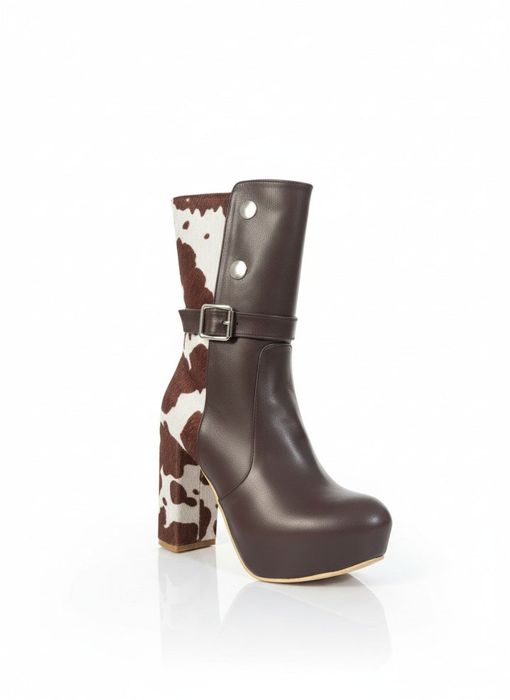 حذاء بوت جريء وعصري يجمع بين خامة ناعمة ونقشة بقر لافتة لإطلالة فريدة وجذابة. كعبه العريض مغطى بالكامل بنقشة البقرة، مع تفاصيل معدنية وحزام جانبي أنيق لإضفاء لمسة راقية. مثالي لعشاق القطع المميزة ذات الطابع القوي والمميز.