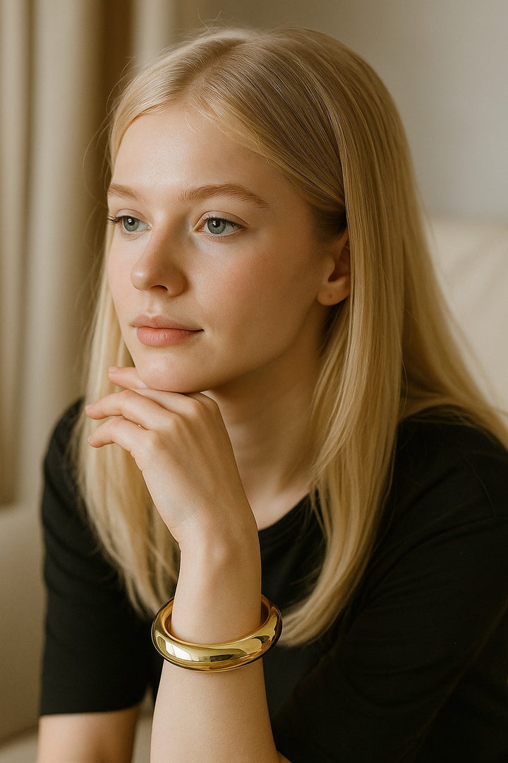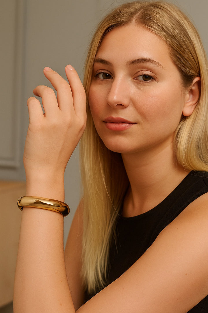 Shine with elegance wearing the Polished Dome Gold Bangle. Its bold rounded silhouette and high-shine gold finish make it the perfect statement piece to complement both casual outfits and glamorous evening looks. A timeless must-have for every jewelry collection.