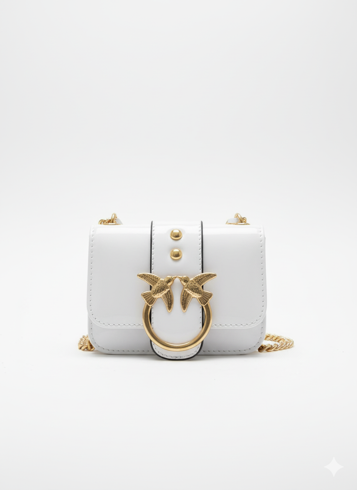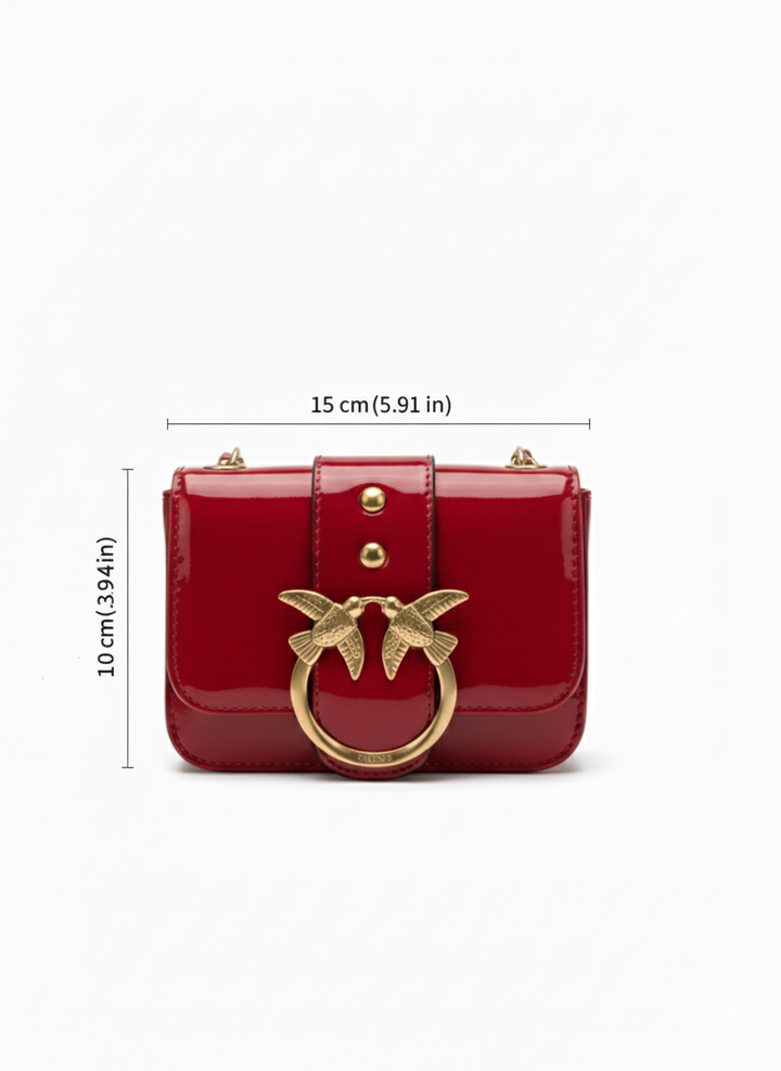 A stylish crossbody bag designed with a glossy finish, featuring a unique gold bird buckle and a matching chain strap. Compact yet practical, it’s the perfect accessory to add a touch of elegance to your daily look or evening outings.