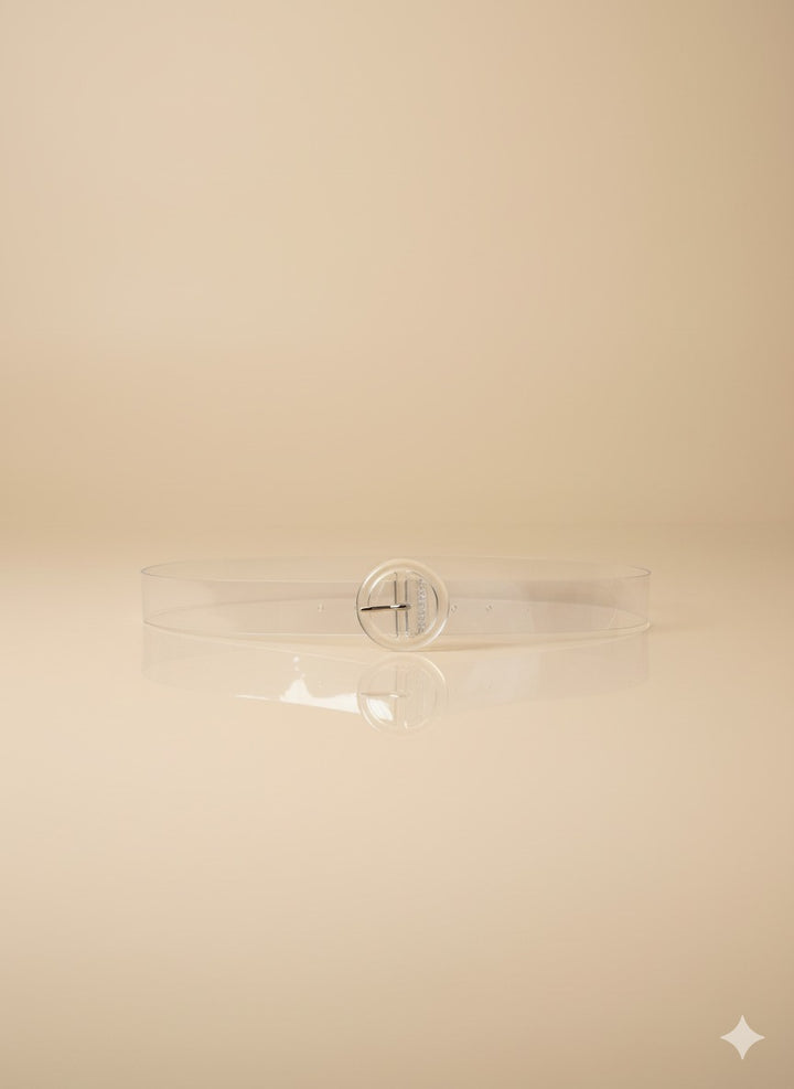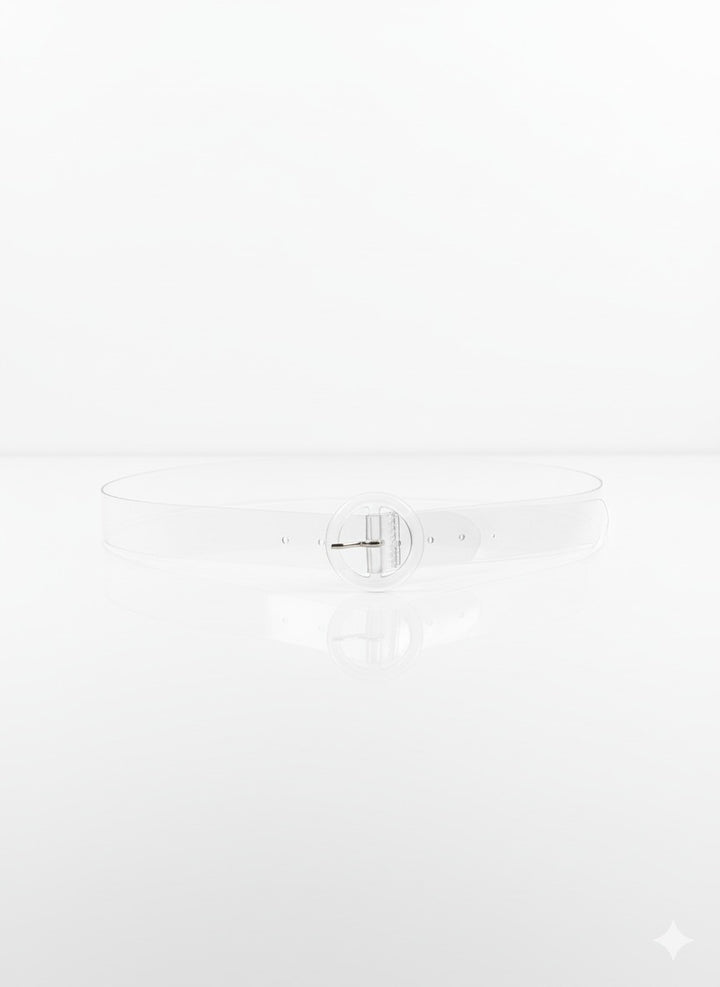 A modern and versatile transparent belt featuring a bold round buckle design. Perfect for adding a trendy twist to dresses, skirts, or casual outfits while defining your waistline with style.