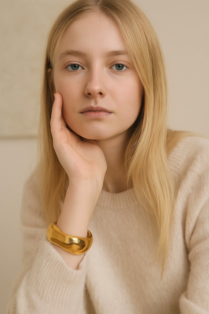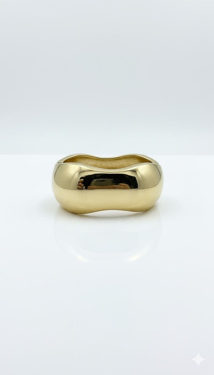 Stand out with the Bold Curve Gold Bangle. Designed with a sleek and sculpted curved silhouette, this bracelet adds a modern, luxurious edge to any outfit. With its polished gold finish, it’s the perfect statement piece for both day and evening wear.