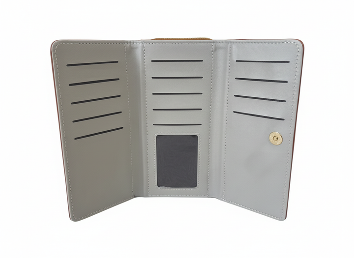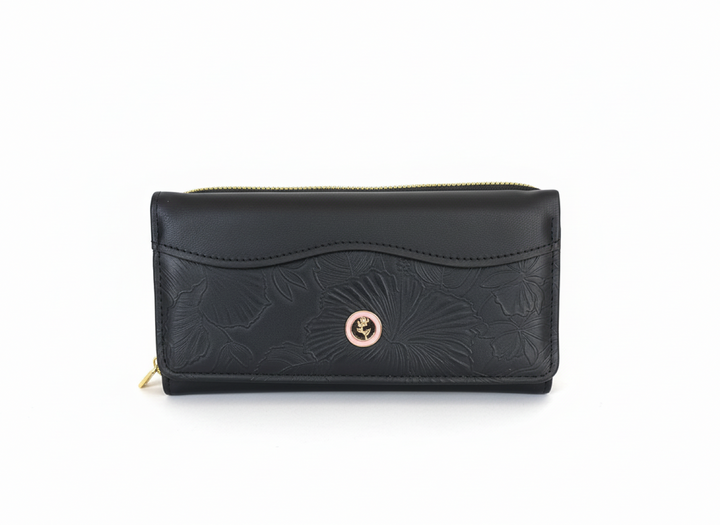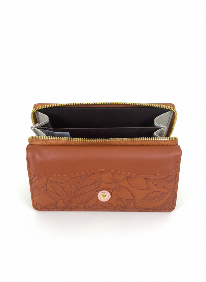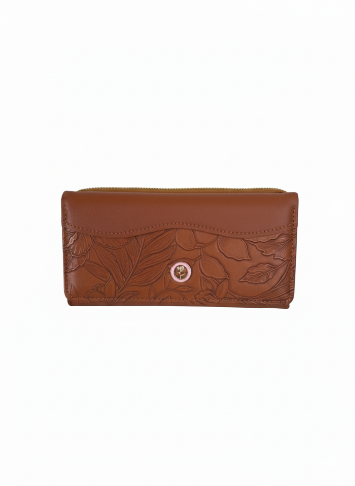 Discover timeless elegance with the "Flora" wallet, designed with a beautifully embossed floral pattern that adds a touch of artistry and sophistication. Made from premium-quality leather in a warm brown tone, it features a smooth curved flap and a secure rose gold twist-lock closure. A perfect blend of charm and functionality, this wallet is ideal for organizing your essentials in style—whether for daily use or as a refined gift.