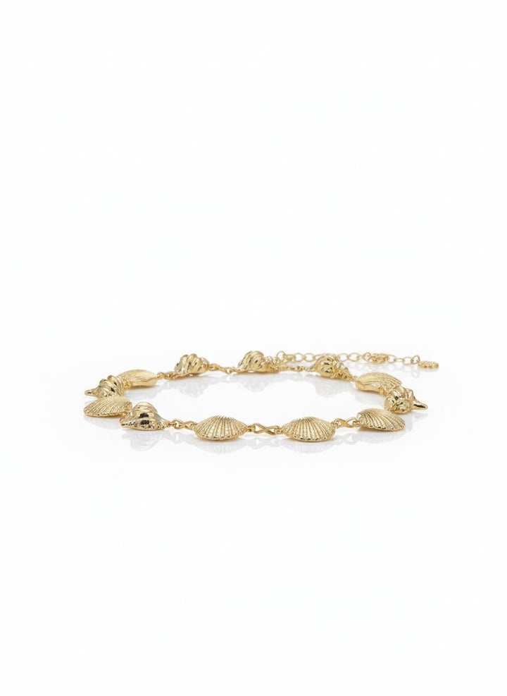 A unique chain belt adorned with elegant gold seashell charms, inspired by seaside vibes. Perfect for styling with dresses, skirts, or pants to add a chic and playful touch to your look.