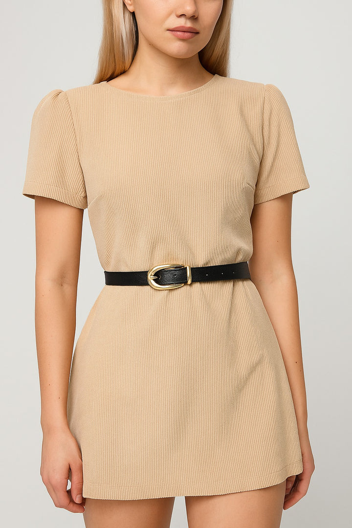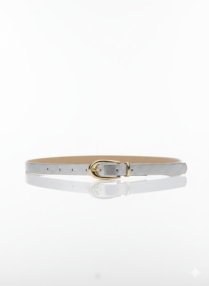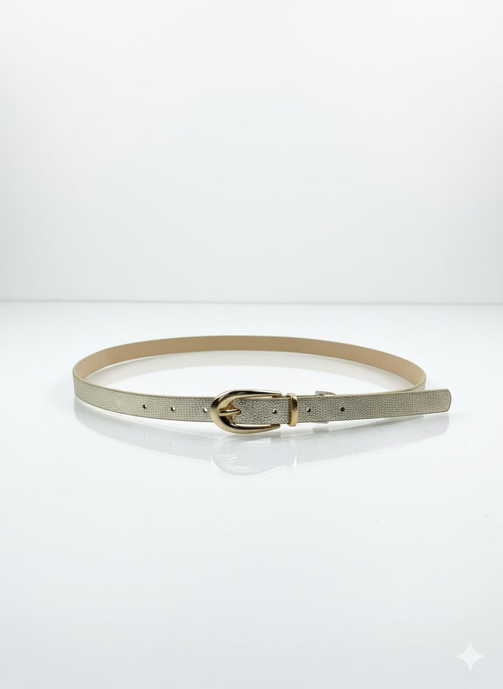 A versatile slim belt designed with a textured finish and a timeless classic buckle. Available in black, gold, and silver, this piece is perfect for elevating casual and formal looks while adding a touch of elegance to your waistline.