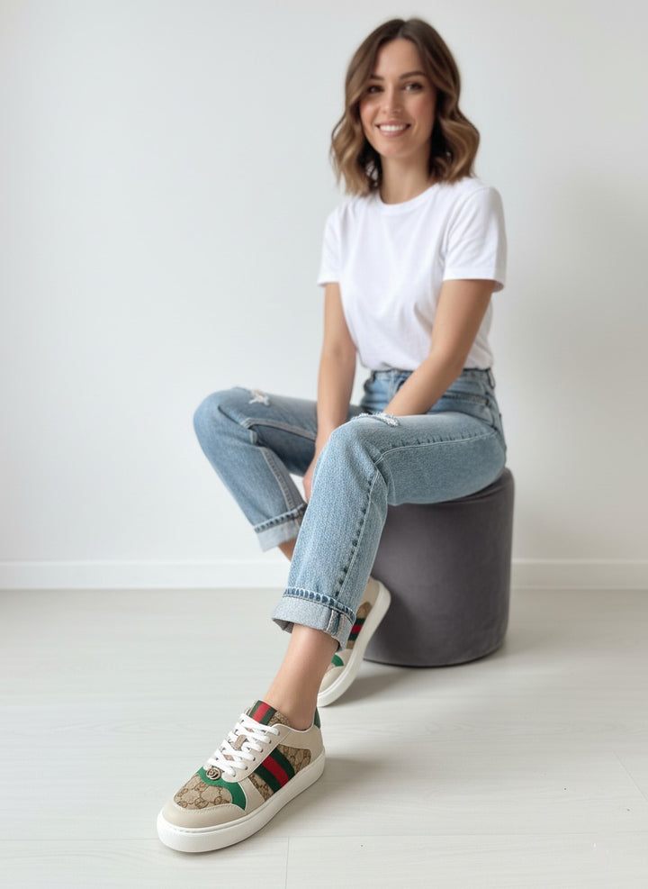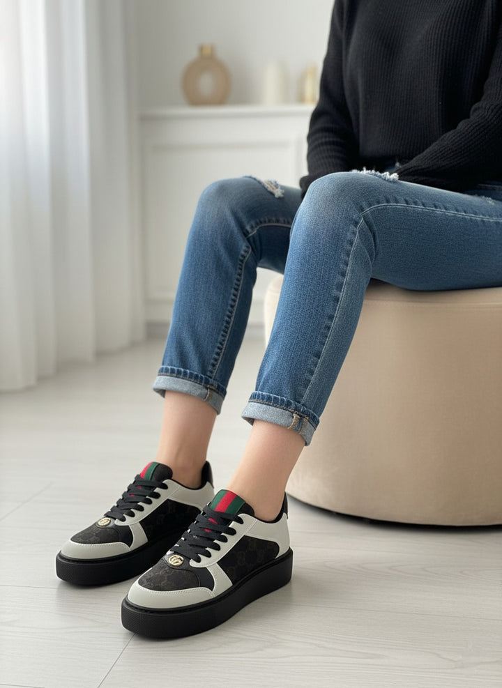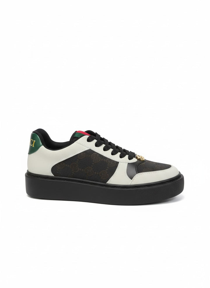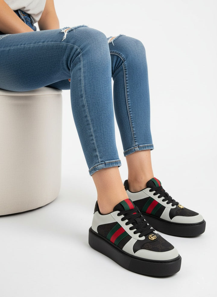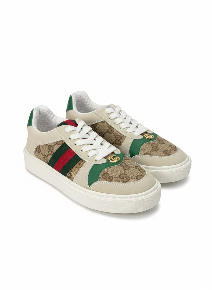 A stylish pair of sneakers designed for both comfort and modern flair. Featuring signature side stripes with a luxury-inspired touch and a refined metallic detail on the front. Built on a cushioned sole for all-day wear, making it perfect for casual outings or smart street-style looks.