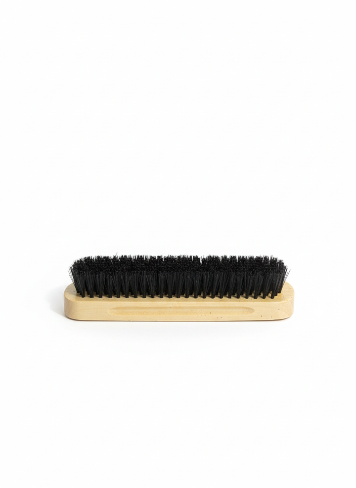 Durable brush with strong bristles and a comfortable wooden handle, perfect for effectively cleaning shoes, leather, and fabrics with ease, keeping them looking new and polished.