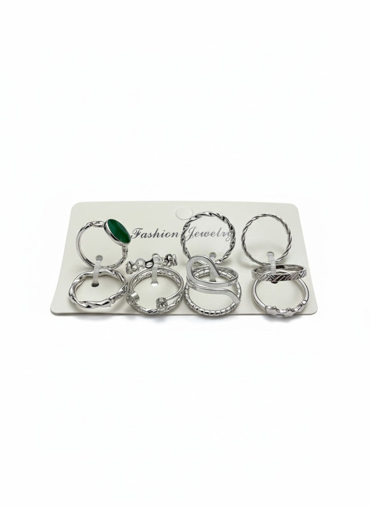 A stylish set of silver-tone rings featuring a mix of modern and chic designs. The set includes textured bands, a ring with a glossy green stone, and twisted patterns that add a unique touch. Perfect to wear individually for a minimal look or stacked together for a bold statement style.