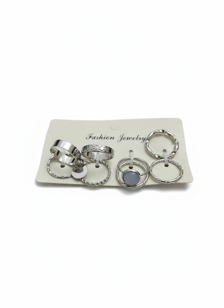 A stylish set of silver-tone rings featuring a mix of modern and chic designs. The set includes textured bands