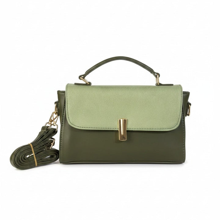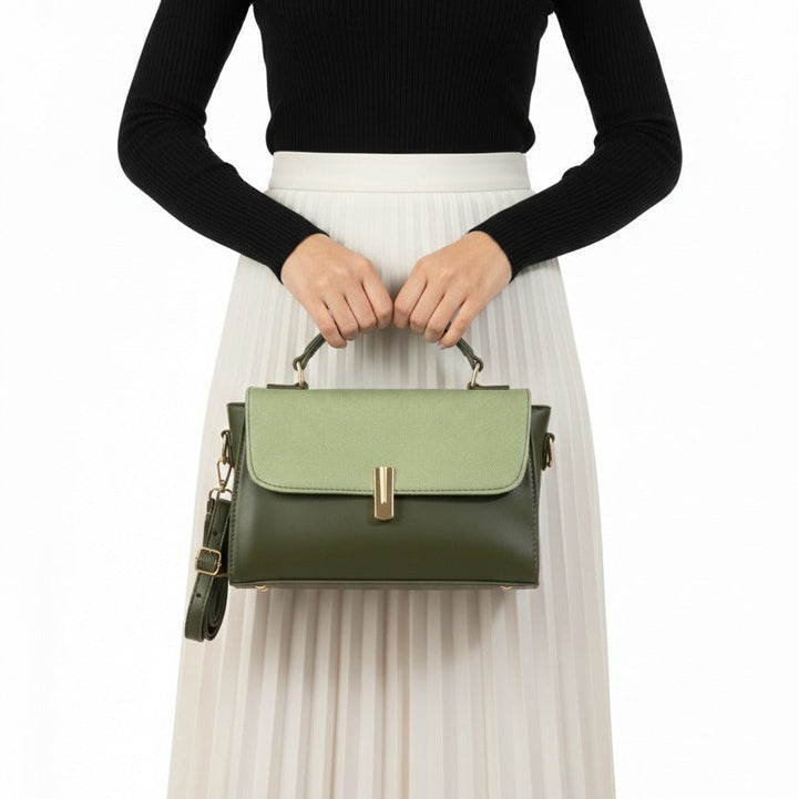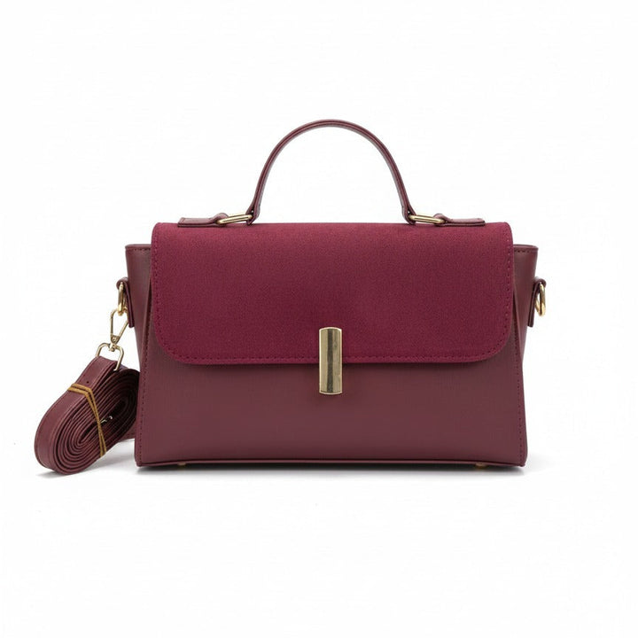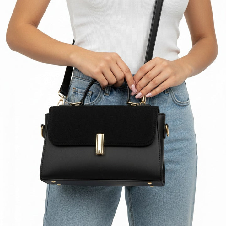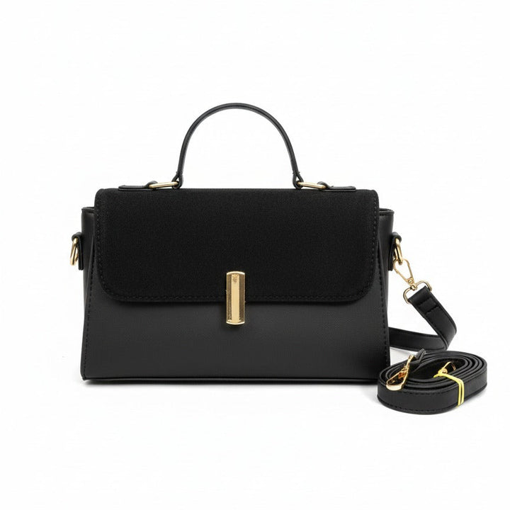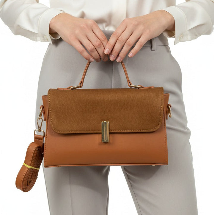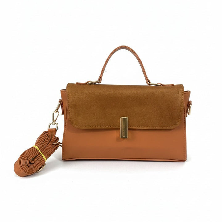 A chic structured handbag crafted from premium leather with a soft suede front panel that adds a refined, luxurious touch. Designed with elegant metallic details, practical interior space, and an adjustable strap for effortless everyday style.