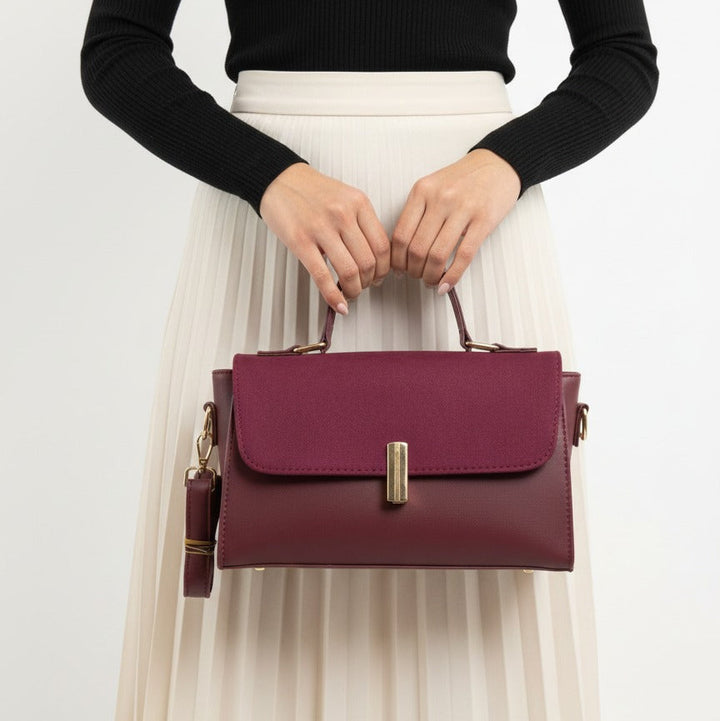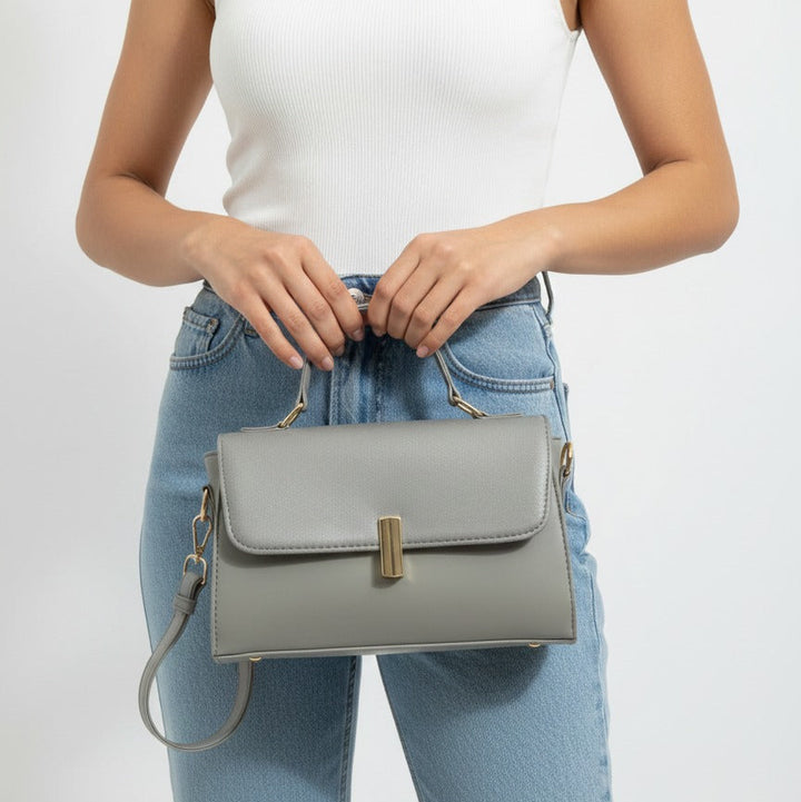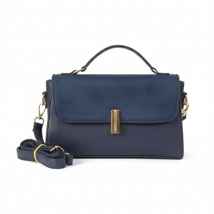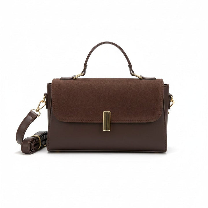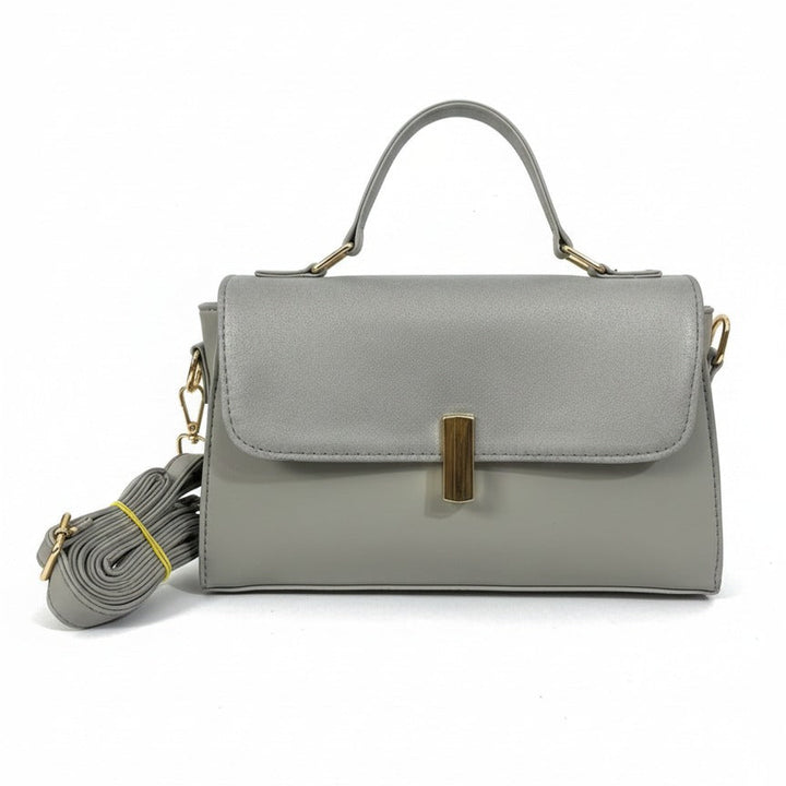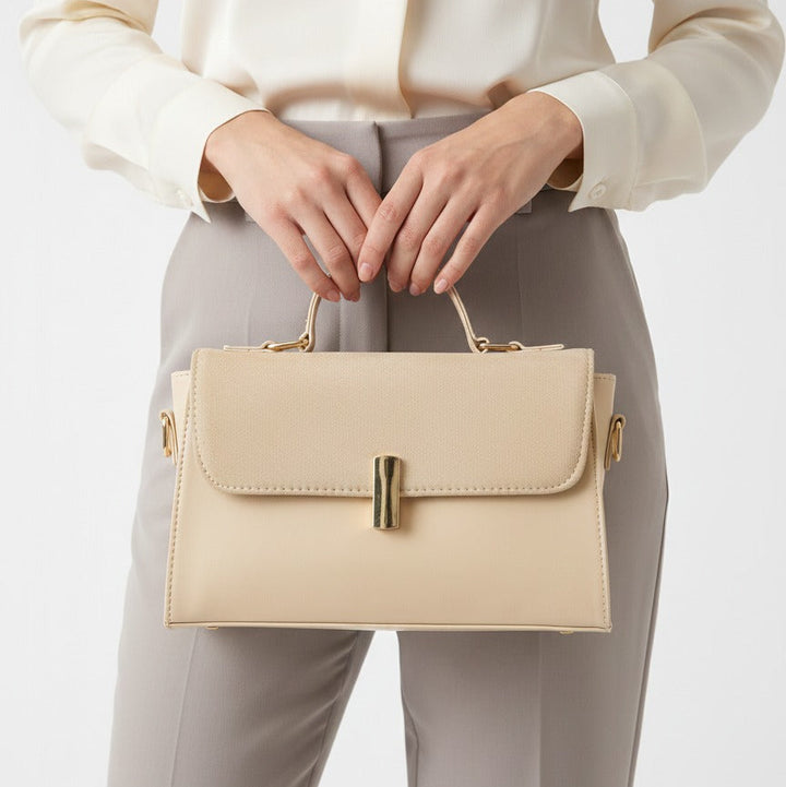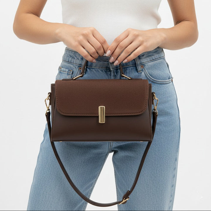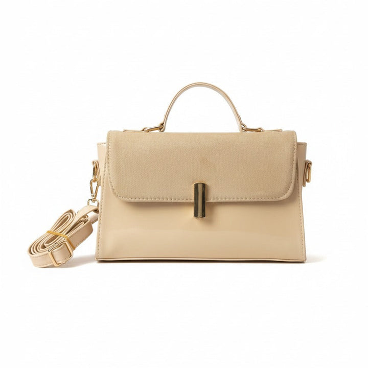A chic structured handbag crafted from premium leather with a soft suede front panel that adds a refined, luxurious touch. Designed with elegant metallic details, practical interior space, and an adjustable strap for effortless everyday style.