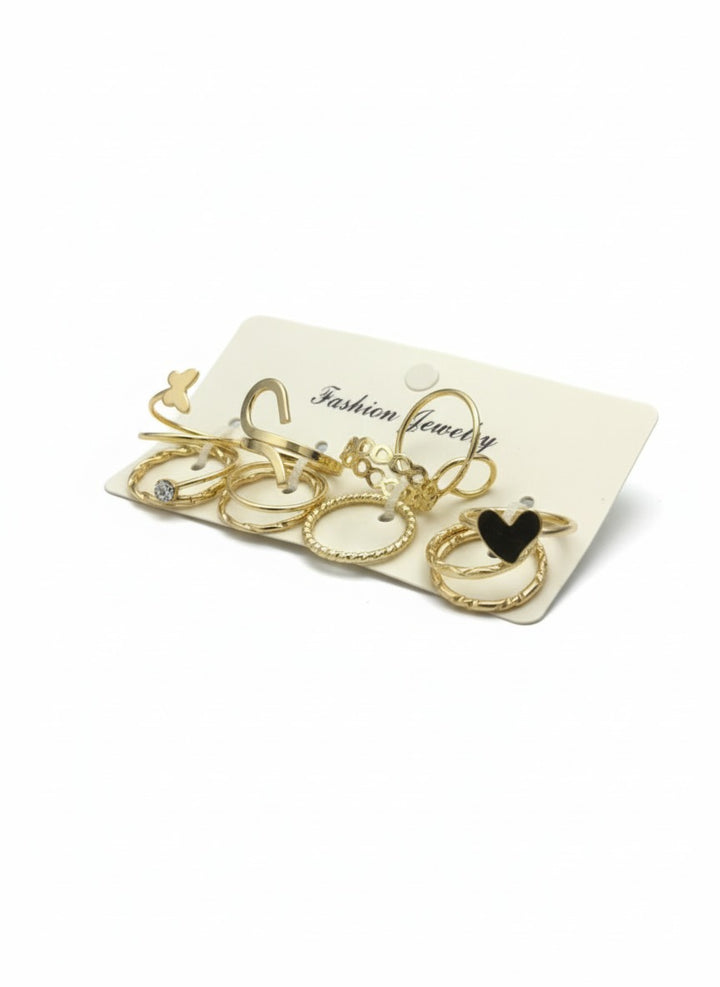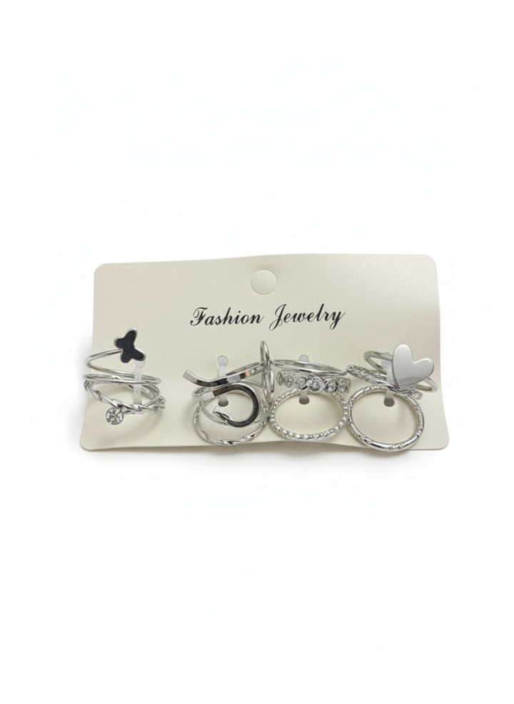 A stylish set of silver-tone rings featuring a mix of modern and chic designs. The set includes textured bands