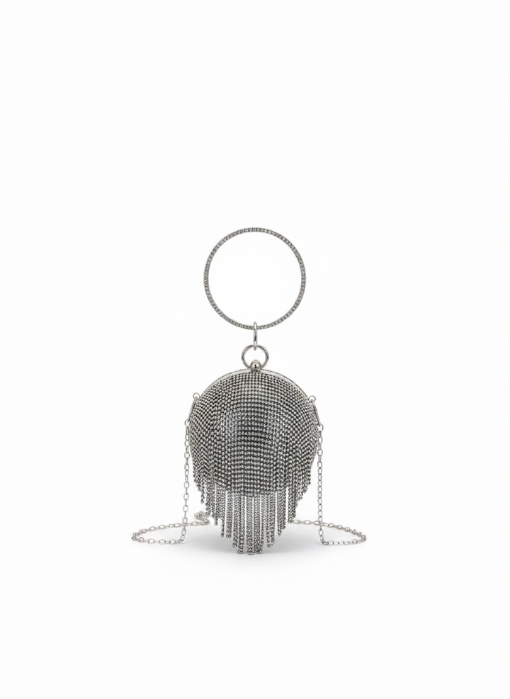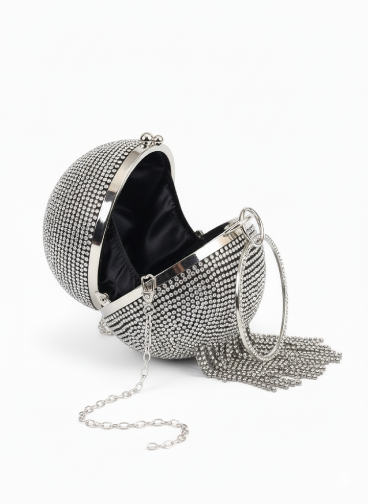 Design: Elegant spherical clutch adorned with crystal rhinestones and cascading chains for a glamorous look.